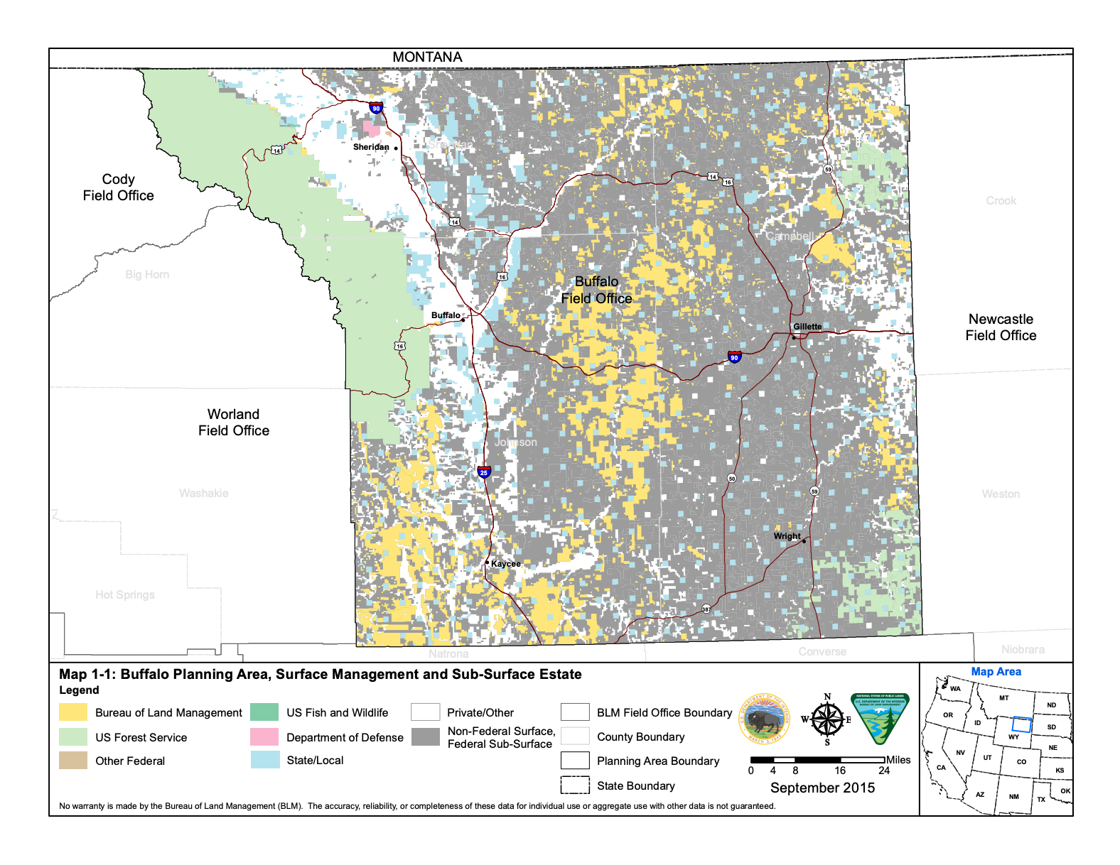 Each RMP covers a huge area of land and minerals, with some covering more than ten million acres! For example, the Buffalo, Wyoming RMP & Final EIS (2015) totals approximately 1,600 pages and covers about 800,000 surface acres and 4.7 million acres of mineral estate.